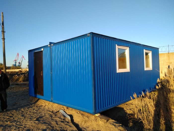 Бытовка модульная с синим профнастилом с размерами 5.0x4.8x2.5 м. Внутренняя отделка выполнена из ДВП/ДСП, внешняя - Цветной. Бытовка оснащена 4 шт. окнами/окном и дверью. Термоизоляция и гидроизоляция бытовки состоит из: Полиэтиленовая пленка 100 мкм. и KNAUF Insulation Термо 50 мм., что позволяет сохранять приемлемую температуру в помещении. Срок гарантии составляет: 6 месяцев. Страна производства - Россия.
